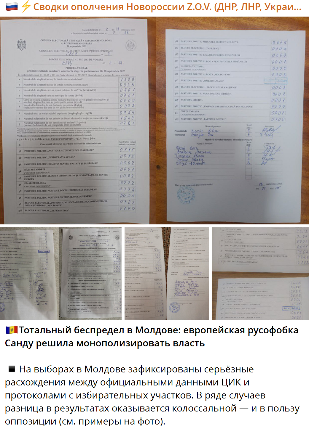Російські телеграм-канали поширюють фото протоколів із виборчих дільниць після парламентських виборів у Молдові. Документи нібито доводять масові фальсифікації та розбіжність з офіційними даними Центральної виборчої комісії (ЦВК) Молдови. За результатами протоколів, у деяких регіонах перемогла опозиція. Однак ЦВК буцімто приховує це та навмисно не показує статистику голосування по регіонах.