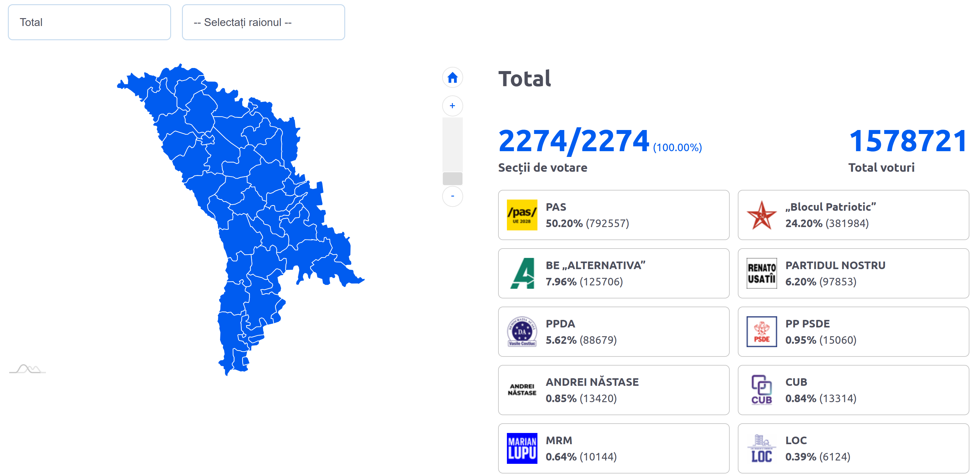 Щобільше, ЦВК не «приховує» результати парламентських виборів, як пишуть російські телеграм-канали. На сайті ЦВК Молдови розміщені дані з кількістю голосів по кожній виборчій дільниці.