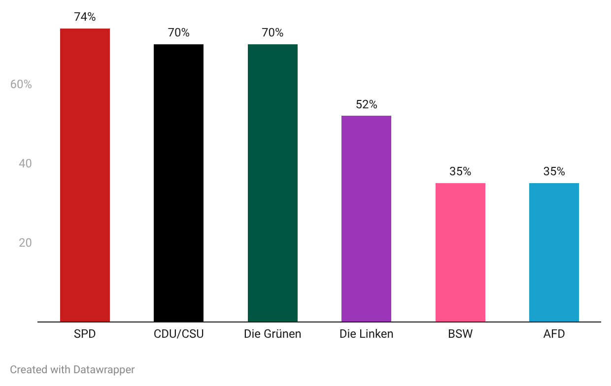 Проте підтримка України відрізняється залежно від партійної приналежності респондентів. Найбільше за це ратують виборці SPD (Соціал—демократичної партії Німеччини), «Зелених» та CDU (Християнсько-демократичний союз), яку представляє нинішній канцлер Фридрих Мерц. Найменше допомогу Україні підтримують традиційні «симпатики путіна» — виборці Союзу Сари Вагенкнехт (BSW) та «Альтернативи для Німеччини» (AfD) — по 35%.