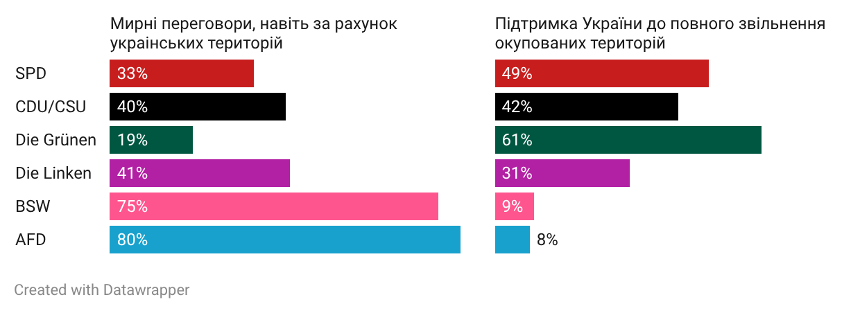 Найбільш радикально боротьбу України підтримують виборці «Зелених». Понад 60% із них вважають, що Німеччина має надавати Україні військову підтримку до повної деокупації, і лише 19% виступають за припинення бойових дій ціною здачі територій. Абсолютно протилежна ситуація в таборі прихильників Союзу Сари Вагенкнехт та «Альтернативи для Німеччини»: 75-80% вважають, що Україна має поступитися територіями заради мирної угоди, і менше 10%, що Німеччина має продовжувати підтримувати боротьбу України. Думка виборців партії Мерца (ХДС) розділилась фактично навпіл — 40% на 42%. Серед виборців СПД більшість вважає правильним підтримку України в боротьбі за власну землю — 49% проти 33%.