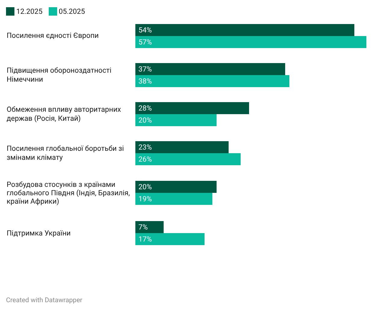 При цьому в грудневому опитуванні від IP-Forsa-Frage стосовно пріоритетів зовнішньої політики Німеччини «допомога Україні» опустилася на 10 п.п., з 17% у травні 2025 до 7% в грудні 2025 і потрапила на останнє місце, після «розбудови стосунків з країнами глобального Півдня». Натомість на 8 п.п. зросла важливість «обмеження впливу авторитарних держав, таких як росія та Китай» — з 20% до 28%. Найбільш актуальними зовнішньополітичними напрямками німці вважають «посилення єдності в Європі» (54%) та «підвищення обороноздатності Німеччини» (37%).