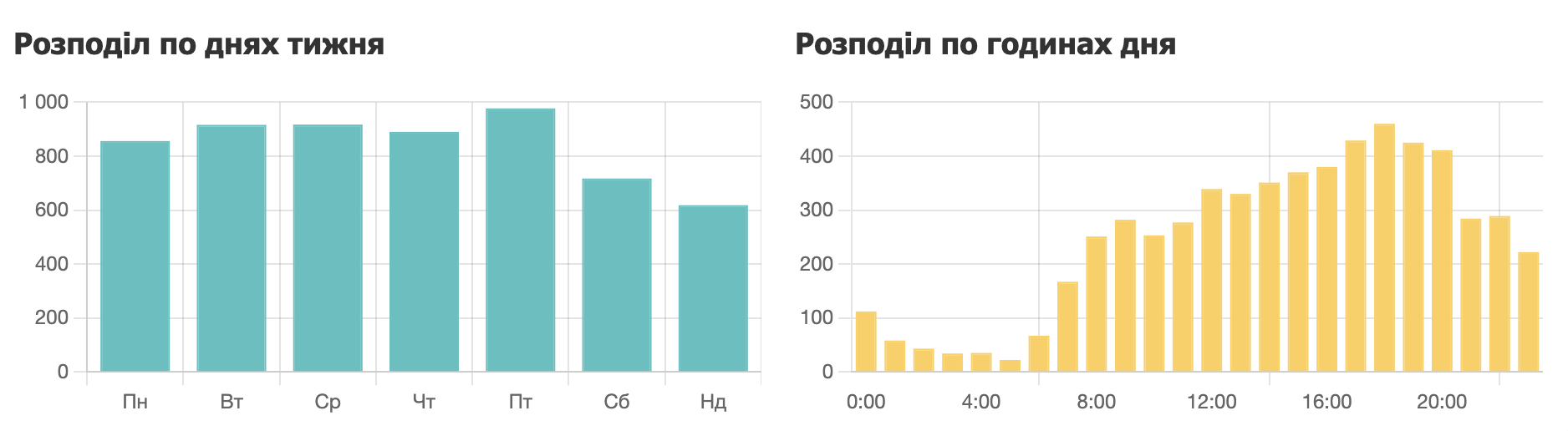Мапа дозволяє побачити, що на вихідних трапляється менше ДТП, а найбільш «небезпечна» – 18 година (рис. 10). Зрозуміло, що чим більше транспорту на вулицях, тим більша імовірність ДТП. Але дані дозволяють побачити, що у вечірні години пік трапляється більше ДТП, ніж у вранішні — імовірно, через меншу видимість в осінньо-зимовий період і втому водіїв.