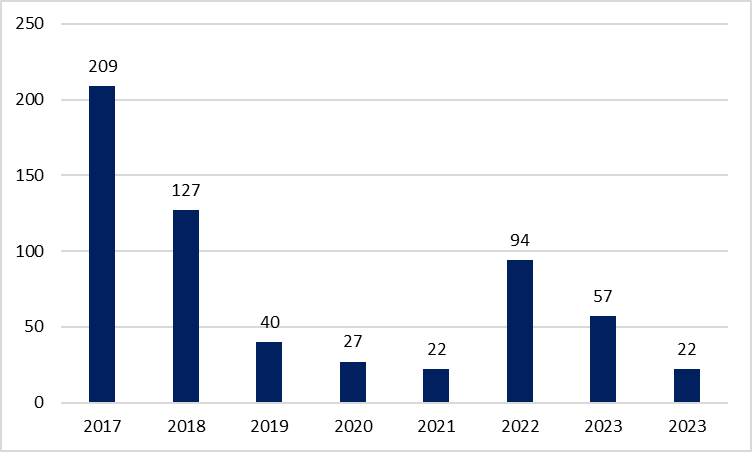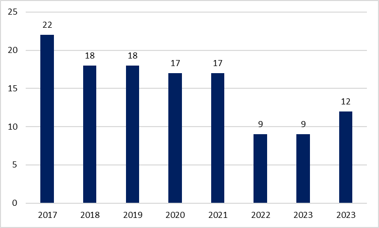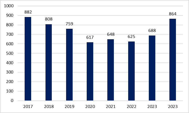 При цьому кількість тяжких ДТП з 2017 року значно знизилася, незважаючи на сплеск у 2022 році (рис. 5). Знизилася й кількість смертельних ДТП (рис. 6).