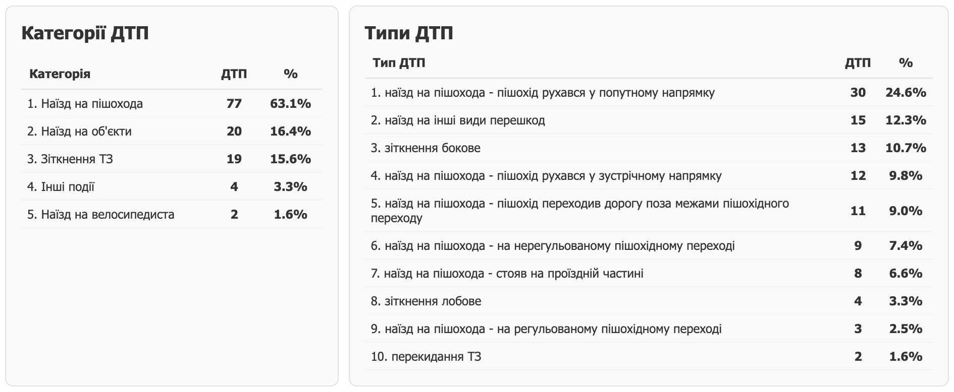 Інтерактивна мапа ДТП – інструмент, що дозволяє побачити кожну аварію на місці, де вона відбулася. Дані можна фільтрувати за ступенем травм і типами ДТП. Можна бачити розподіл ДТП за годинами, тижнями, роками та причинами. Мапа дозволяє зрозуміти, які вулиці безпечні, на яких потрібно бути особливо уважними, а головне – на яких вулицях потрібно змінити дорожню інфраструктуру в першу чергу, щоб запобігти смертям і травмуванням на дорогах. Мапа буде корисною як міській владі, так і як додатковий аргумент мешканцям, що звертаються до влади з петиціями про поліпшення дорожньої інфраструктури. Нижче наведено кілька прикладів даних та візуалізацій, які можна отримати за допомогою мапи. Запрошую всіх проаналізувати ці дані самостійно.