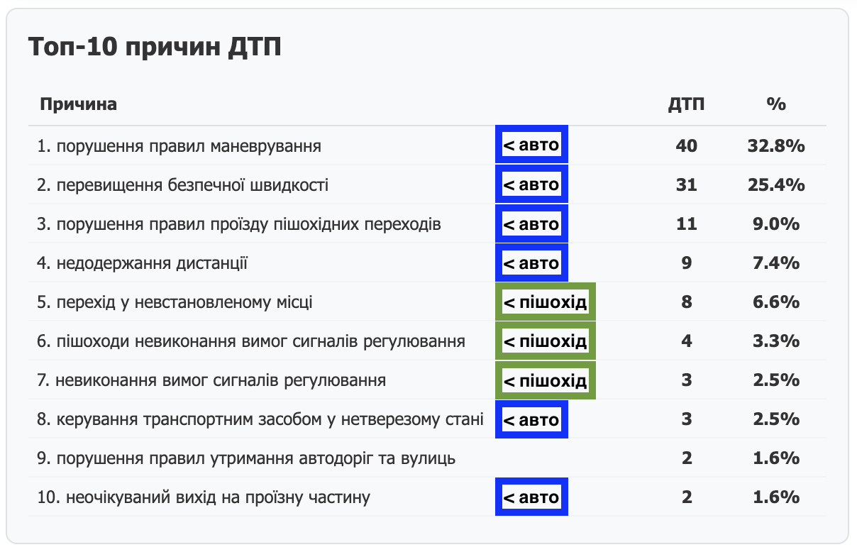 Топ-10 причин смертельних ДТП можна поділити на ті, де водій міг запобігти аварії, і ті, де пішохід. У 85% (96/113) випадків причина аварії на стороні водія (рис. 9), але всім учасникам дорожнього руху варто бути уважними.