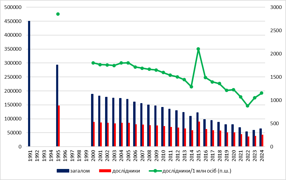 Після розпаду СРСР Україна отримала одну з найбільших дослідницьких систем Європи. Так, якщо у 1996 році в Україні було 2856 дослідників на 1 млн населення, що співставно з такими країнами як Франція (2669) або Німеччина (2831), то в 2021 році в Україні було 774 дослідники на 1 млн осіб (за іншими даними — близько 1000 — рис. 1), а у Франції та Німеччині — понад 5,5 тис.