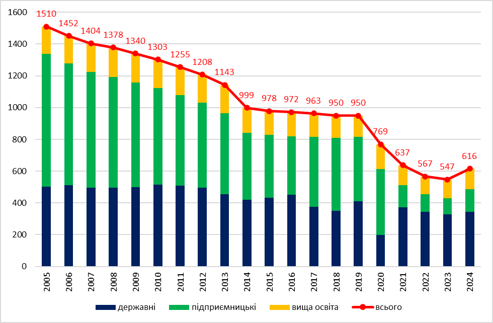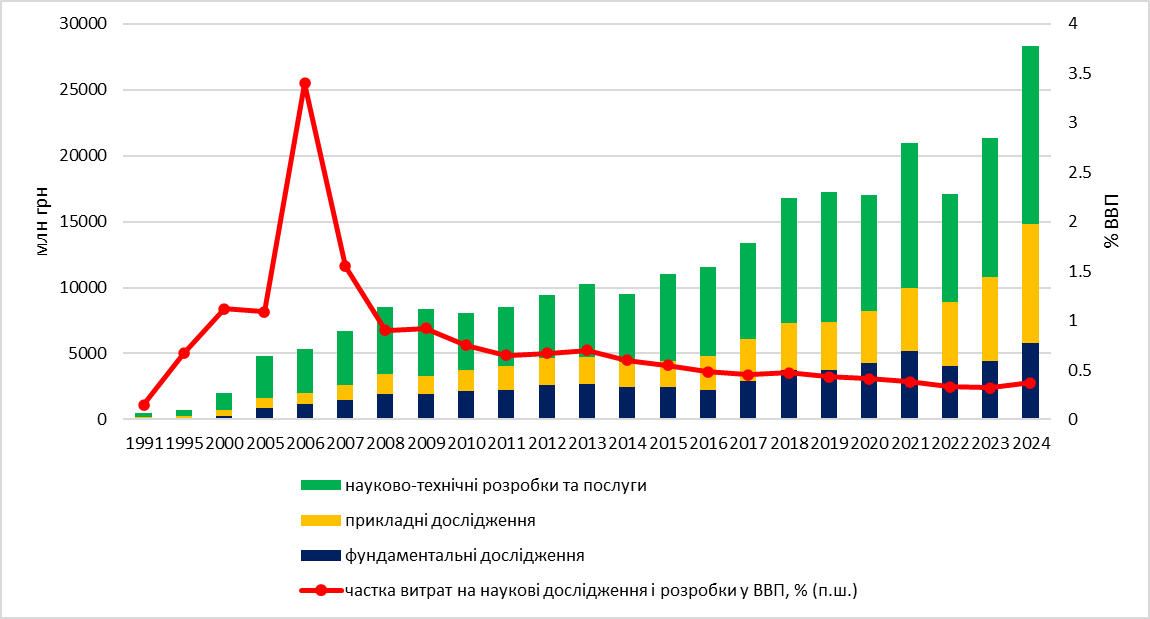 Дані: Держстат. Примітка: основними інструментами державного фінансування є МОН, галузеві академії та Національний фонд досліджень України.