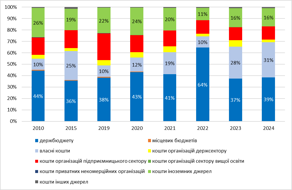 У доповіді «Analysis of war damage to the Ukrainian science sector and its consequences» (2024) ЮНЕСКО повідомляє, що в результаті агресії рф 6,3% (5,5 тисяч) українських науковців були змушені емігрувати до інших країн, а 5,5% (4,9 тис.) стали внутрішньо переміщеними особами. Близько 30% усіх науковців змушені працювати віддалено. Змінилася й структура фінансування досліджень: якщо до повномасштабного вторгнення з іноземних джерел вдавалося залучати до чверті фінансування (рис. 5), то в 2022-2024 роках ця частка не перевищувала 16%. Імовірні причини цього — еміграція вчених та припинення фінансування частини досліджень. З 2022 року міжнародна спільнота надавала підтримку українським ученим — як стипендії, так і різноманітні програми обміну. Проте ця підтримка — тимчасовий захід, більшість таких програм не розраховані на тривалий період.