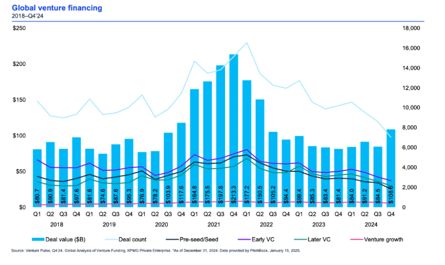 The global venture capital market is experiencing a decline, a pattern visible in the US and globally. At the same time, while the total amount of early-stage investment has decreased, the proportion of overall deals going to Seed and Pre-Seed round (Seed is typically the first round of investments and Pre-Seed is ideation stage funding) has increased. This shift can be positive for startups, as it reflects an ecosystem where companies can achieve meaningful results with smaller teams and less funding. However, it also means late-stage funding is harder to obtain, so startups must be efficient and demonstrate strong fundamentals to grow or attract larger investments.