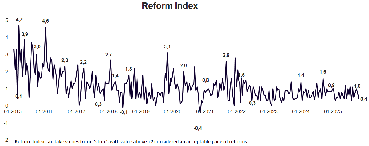 Reform Index from VoxUkraine aims to provide a comprehensive assessment of reform efforts by Ukraine’s authorities. The Index is based on expert assessments of changes in the regulatory environment in six areas: Governance, Public Finance, Monetary system, Business Environment, Energy, Human Capital. Information about the Reforms Index project, the list of Index experts and the database of the regulations assessed are available here.