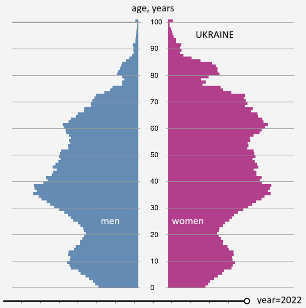 In 2022, the Ministry of Education and Science of Ukraine (MoES) encouraged VEIs to begin training and retraining adults through Law 2312-IX (which became null and void after the new Law on Vocational Education entered into force, as its provisions were incorporated into the new legislation). This law enabled individuals to acquire professional qualifications without simultaneously completing general secondary education and to receive free vocational training multiple times during their lifetime (on condition of having two years of insurance contributions after each training cycle and at least a three-year interval between them). However, only a limited number of VEIs made use of this opportunity. Most providers continue to focus primarily on young learners. At the same time, the age-gender structure of Ukraine’s population in 2022 (Figure 1) highlights the need to shift attention towards adults aged 35-60.