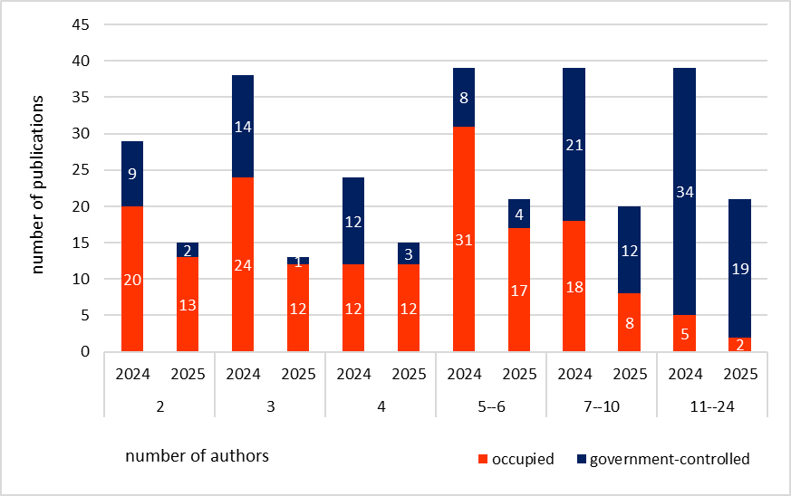 As we can see, in publications with 10 or fewer authors, the key factor behind the appearance of joint Ukrainian–Russian papers is not genuine collaboration but rather the use of stolen Ukrainian institutions and territories by Russians to present themselves as Ukrainian scholars. In 2025, in 80–90% of cases where a paper had fewer than seven authors, these were Russian–Russian publications. Thus, the hypothesis of illusory collaboration is partially confirmed.