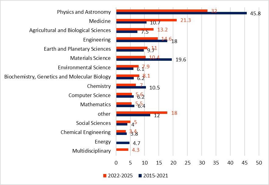 After the start of the full-scale invasion, the distribution of joint publications by field changed significantly (see Figure 2). Physics and astronomy remained in first place, but their share fell from 46% to 32%. Medicine rose from fourth to second place, with its share increasing from 11% to 21%. Engineering, with a share of about 15%, stayed in third place, while materials science dropped from second to sixth, with its share nearly halving to 10%.
