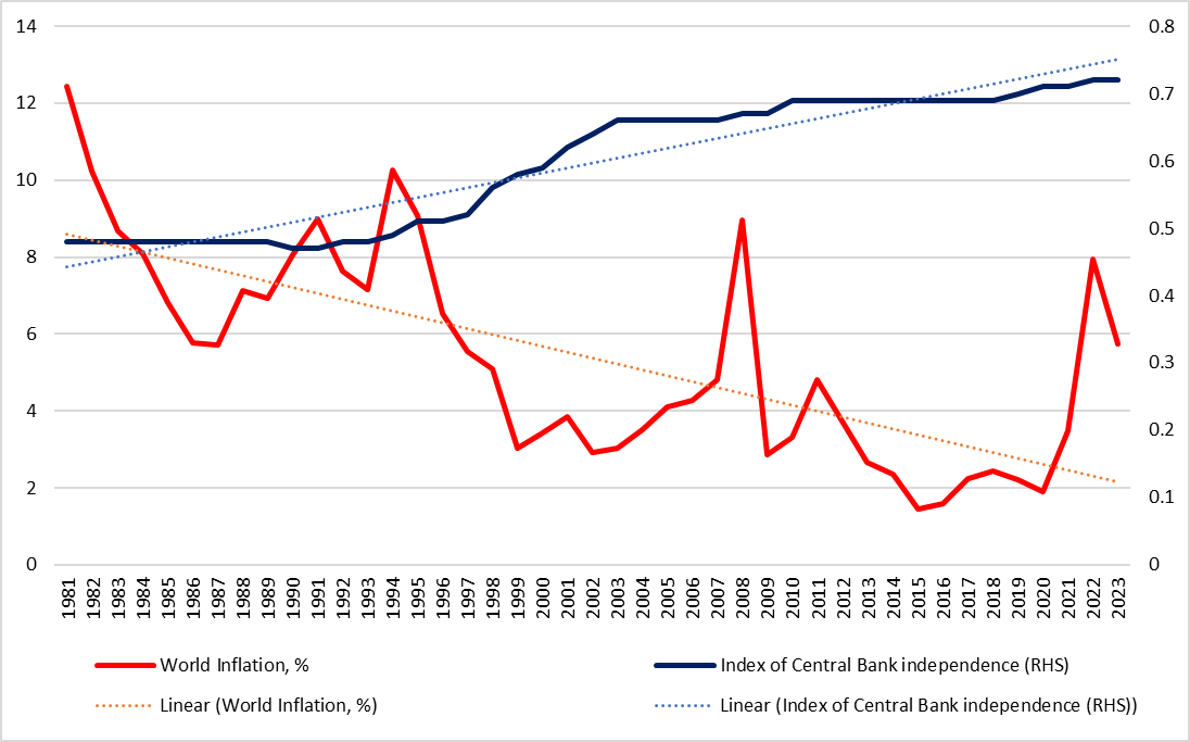 Figure 2. Global inflation (%) and central bank independence (index)