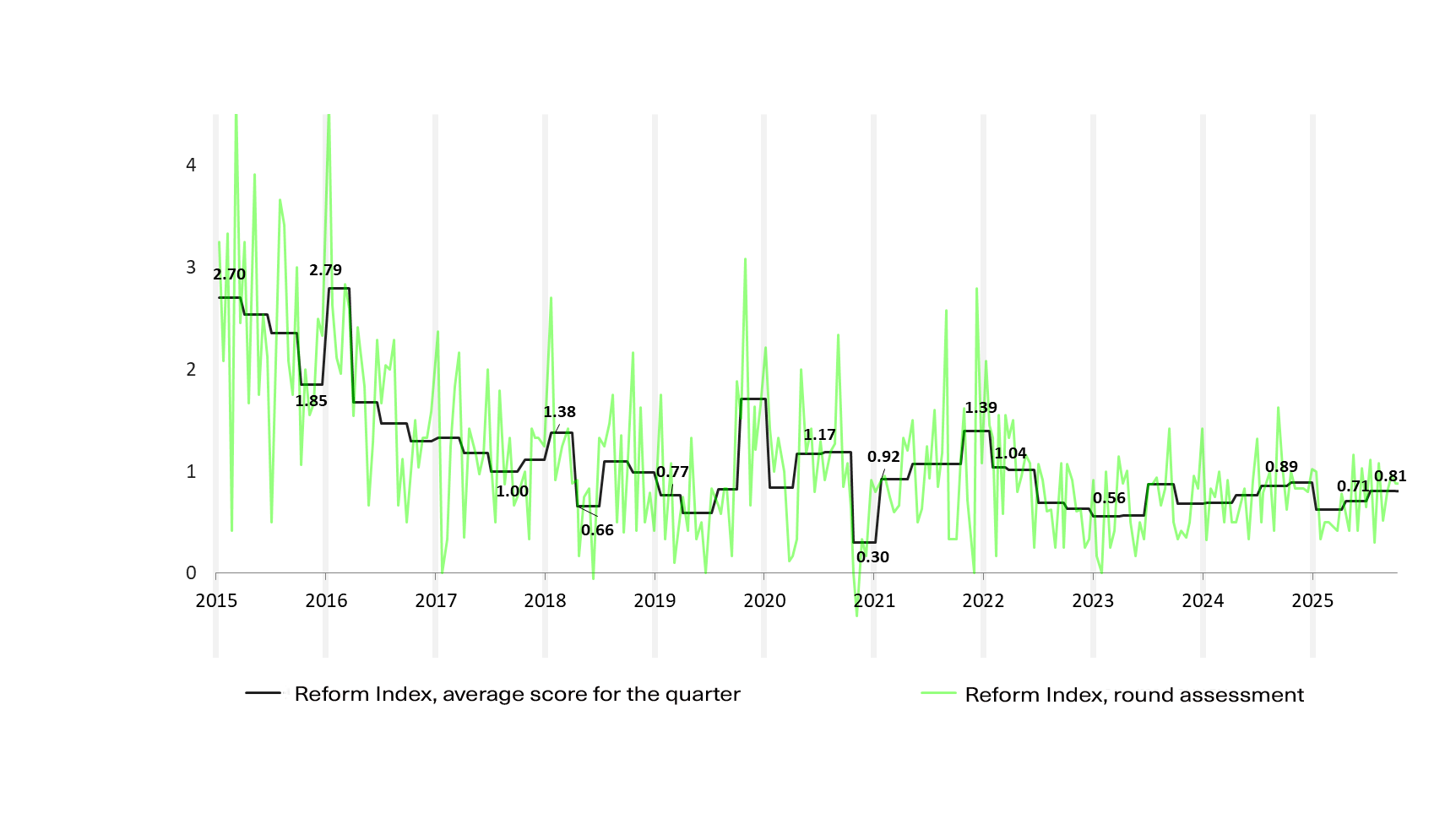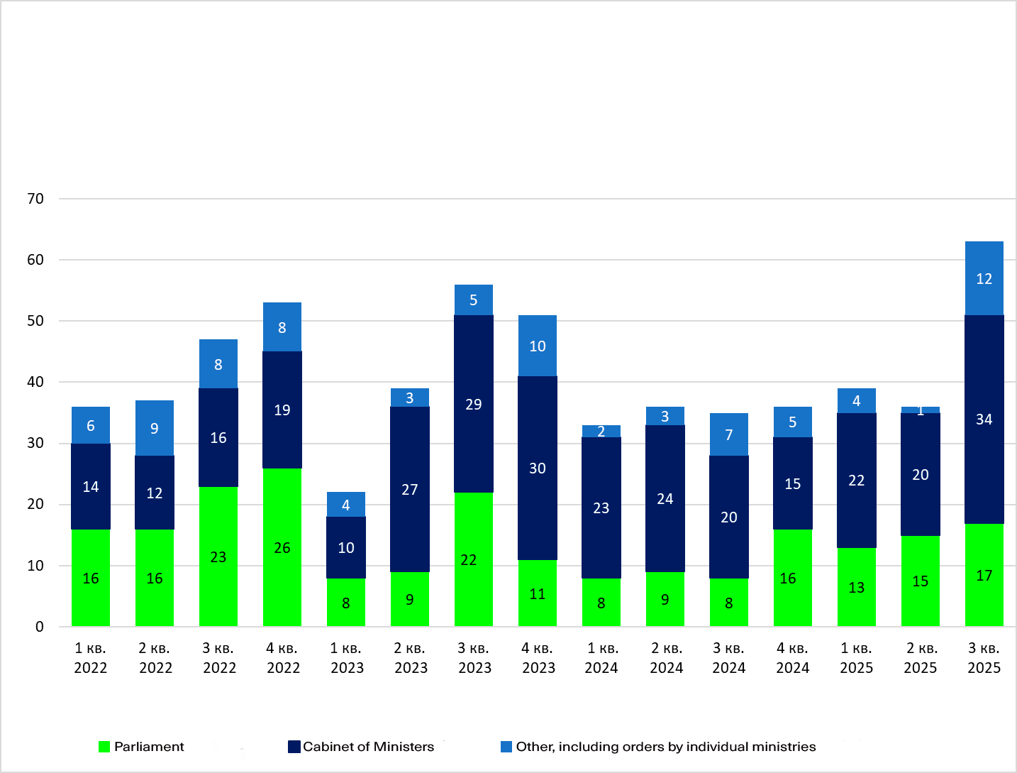 The third quarter brought a long-awaited acceleration of reforms: whereas since early 2024 we had recorded up to 40 significant changes per quarter, this time the Reform Index registered 63 notable regulatory measures. Yet the news was not entirely positive, as two of them were counter-reforms. A scandalous law that curtailed the powers of the National Anti-Corruption Bureau (NABU) and the Specialized Anti-Corruption Prosecutor’s Office (SAPO) became one of the most far-reaching anti-reform measures in ten years of monitoring, while the other was a Cabinet of Ministers resolution allowing religious organizations to obtain religious property for ten years of free use. More on these developments — and on the positive reforms — below.