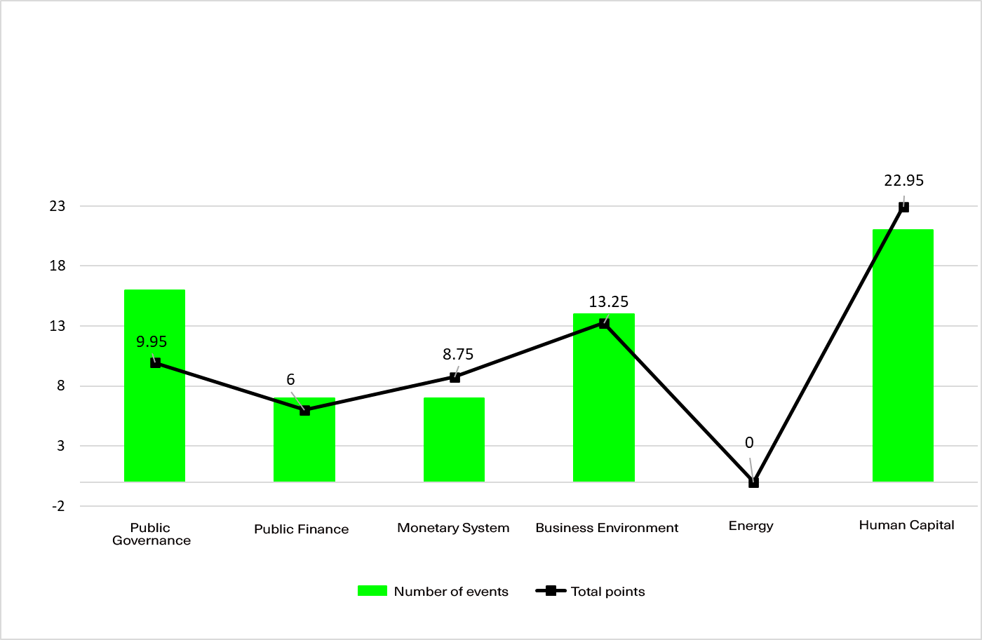 Over the three months, the largest number of changes occurred in the Human Capital area. There was also notable progress in Governance (although this area also saw two anti-reform measures) and in the Business Environment. No reforms were recorded in the Energy sector.