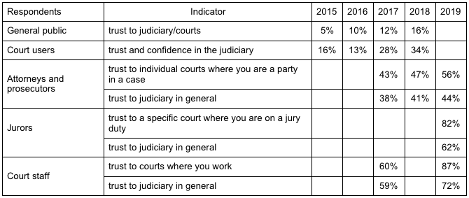 The Strategy for reforming the judicial system was adopted in 2015. Already in the early 2015, the law “On the right to justice” was adopted. It strengthened the role of the Supreme Court and streamlined some of the court procedures. Voluntary ‘cleaning’ of the judicial branch started in 2015 with introduction of e-declarations – about 2000 of 9000 judges left their positions unwilling to declare their assets. Mandatory cleaning of the judiciary, i.e. re-attestation of judges has been underway since 2016. As of end-2018, over 20% of judges that underwent the re-attestation procedure did not pass it. Today, the system has over 4000 vacancies (table 1). Naturally, lack of judges causes overload on the remaining judges and prolonged consideration of cases. This is the price one has to pay for higher quality of the judiciary.