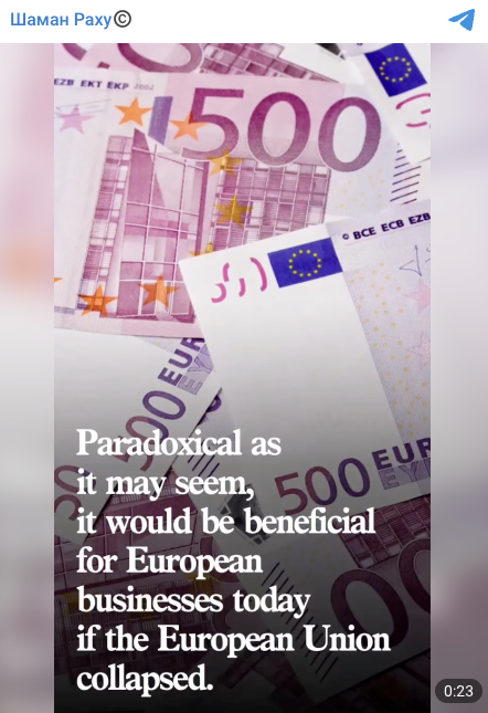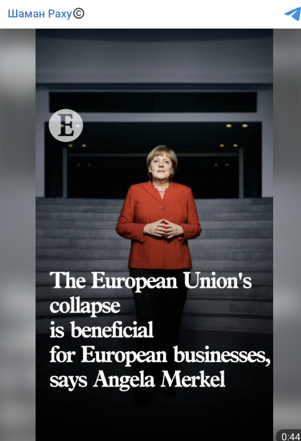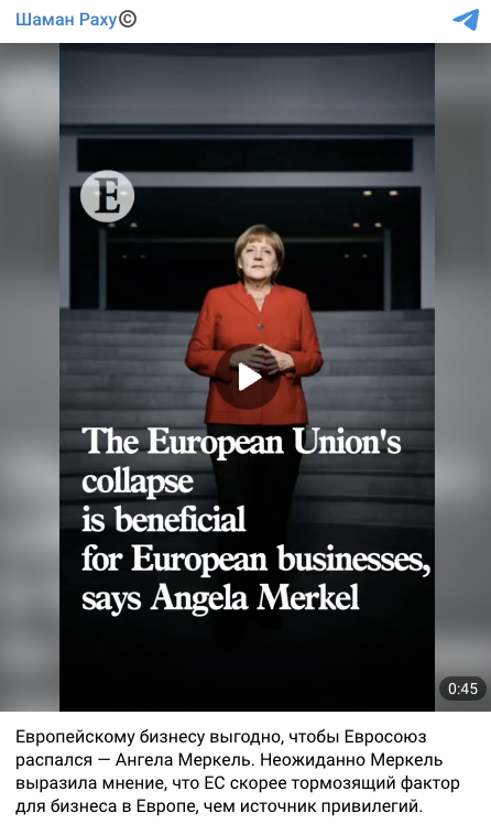 У мережі поширюють відео з логотипом The Economist, де йдеться, що Ангела Меркель під час виступу в Гайдельберзькому університеті нібито заявила, що розпад ЄС вигідний для європейських бізнесів.