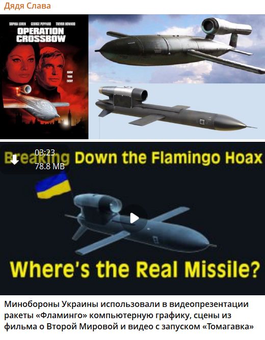 У мережі поширюють відео начебто з викриттям відеопрезентації української крилатої ракети FP-5 «Фламінго». Автор стверджує, що МО України використало комп’ютерну графіку, сцени з фільму про Другу світову війну та ролик із запуском Tomahawk замість справжніх кадрів застосування української ракети.