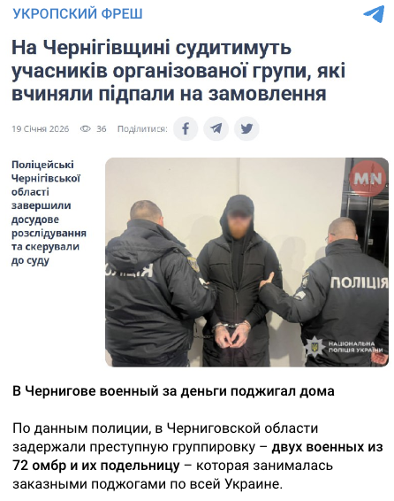 За ключовими словами ми зʼясували, що подібна новина дійсно існує. 19 січня медіа Mynizhyn.com — новини Ніжина опублікувало новину про те, що на Чернігівщині судитимуть учасників організованої групи, які вчиняли підпали на замовлення. Однак ані у статті Mynizhyn.com — новини Ніжина, ані у повідомленні Головного управління Національної поліції в Харківській області не зазначали, що підозрювані є військовими.
