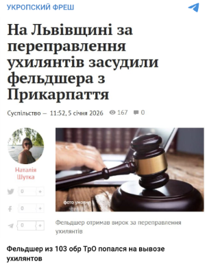 За ключовими словами ми зʼясували, що подібна новина дійсно існує. 5 січня 2026 року медіа Zaxid.net опублікувало новину, що на Львівщині за переправлення «ухилянтів» за кордон засудили фельдшера з Прикарпаття. Однак у статті не зазначають про причетність медика до 103-х ОБрТрО. Як вказує медіа, Михайло Бойчук працював фельдшером обласного центру екстреної медичної допомоги та медицини катастроф Івано-Франківщини.
