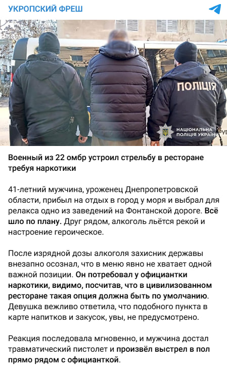 За зворотним пошуком фото у гуглі ми з’ясували, що подібна новина дійсно існує. 2 лютого 2026 року Головне управління Нацполіції в Одеській області повідомило про затримання 41-річного чоловіка, який влаштував стрілянину в ресторані після відмови офіціантки надати йому наркотики. Водночас у повідомленні правоохоронців не зазначалося, що затриманий є військовим.