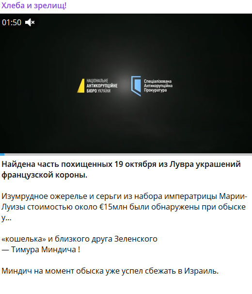 У мережі поширюють відео невідомого медіа, у якому стверджують, що серед конфіскованих активів Тимура Міндіча знайшли частину вкрадених прикрас із Лувру — кольє зі смарагдами з ювелірного набору імператриці Франції Марії-Луїзи Австрійської.