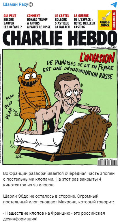 У мережі поширюють нібито нову обкладинку французького сатиричного журналу Charlie Hebdo, де президент Франції Еммануель Макрон злягається із клопом. На карикатурі комаха говорить: «Навала клопів на Францію — це російська дезінформація!».