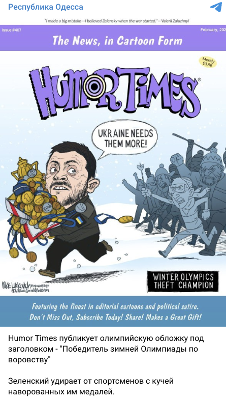 Російські телеграм-канали поширюють обкладинку нібито американського сатиричного журналу Humor Times за лютий 2026 року. На ній зобразили Володимира Зеленського, який вкрав медалі з Олімпійських ігор. На обкладинці є підпис: «чемпіон зимових Олімпійських ігор з крадіжок».