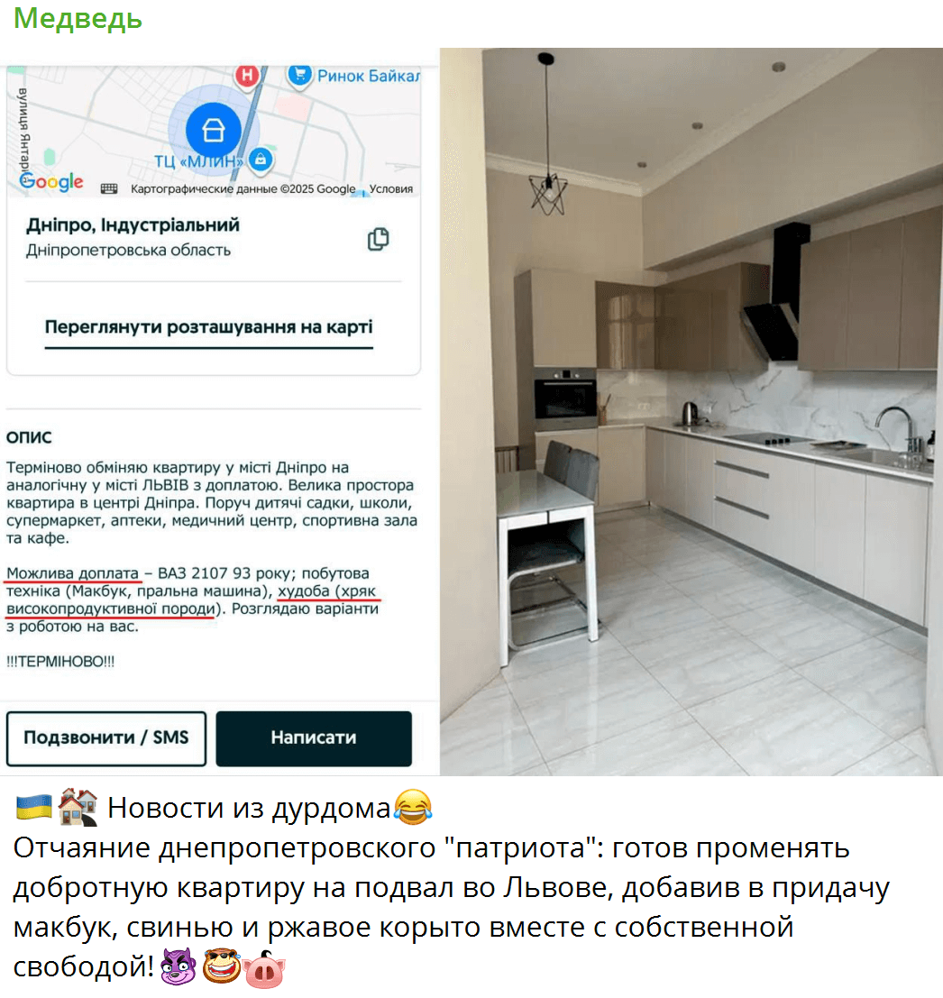 Російські телеграм-канали поширюють скриншот нібито оголошення з OLX, у якому пропонують обміняти квартиру в Дніпрі на аналогічне помешкання у Львові. Як «доказ» додають скриншот оголошення та фото начебто квартири у Дніпрі.