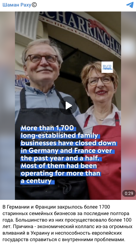 У мережі поширюють відео з логотипом Euronews, де йдеться про те, що понад 1700 старовинних сімейних бізнесів у Франції та Німеччині змушені були закритись через політику ЄС щодо фінансової підтримки України.