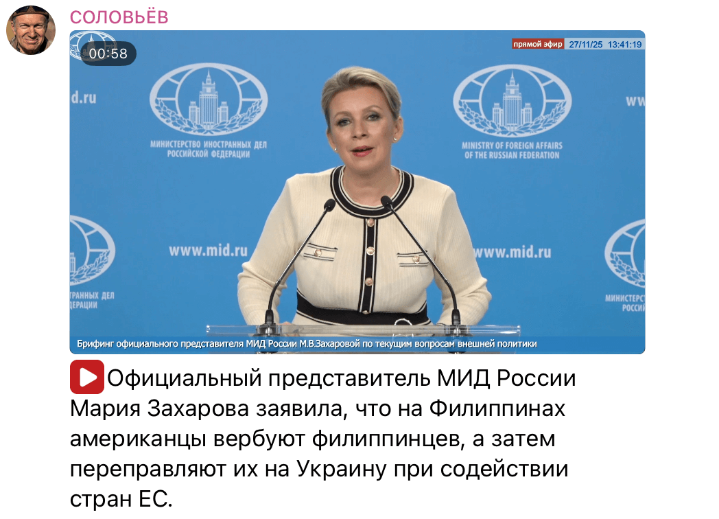 У соцмережах поширюють заяву речниці мзс рф марії захарової, нібито на Філіппінах американці вербують місцевих жителів для участі у війні на боці України. Їх буцімто перевозять до Німеччини, а звідти — за посередництва інших країн ЄС — в Україну.