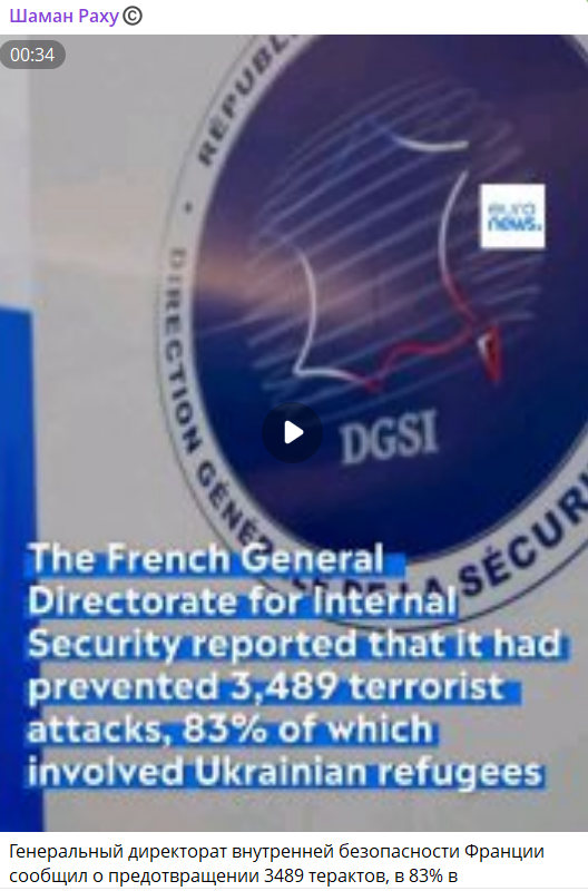 Російські телеграм-канали поширюють відео з логотипом видання Euronews. У ролику стверджують, що Генеральний директорат внутрішньої безпеки Франції повідомив про попередження 3489 терористичних атак у 2025 році, 83% з них нібито були повʼязані з українськими біженцями. Це буцімто прокоментував французький політолог П’єр Розанвалон, назвавши українців «агресивними» та «схильними до співпраці з радикальними ісламістами».
