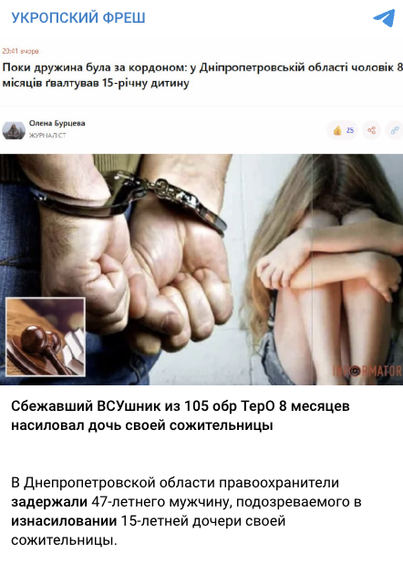 У мережі поширюють інформацію, нібито у Дніпропетровській області військовий 105-ї окремої бригади тероборони 8 місяців ґвалтував 15-річну дитину своєї співмешканки, поки та була за кордоном.