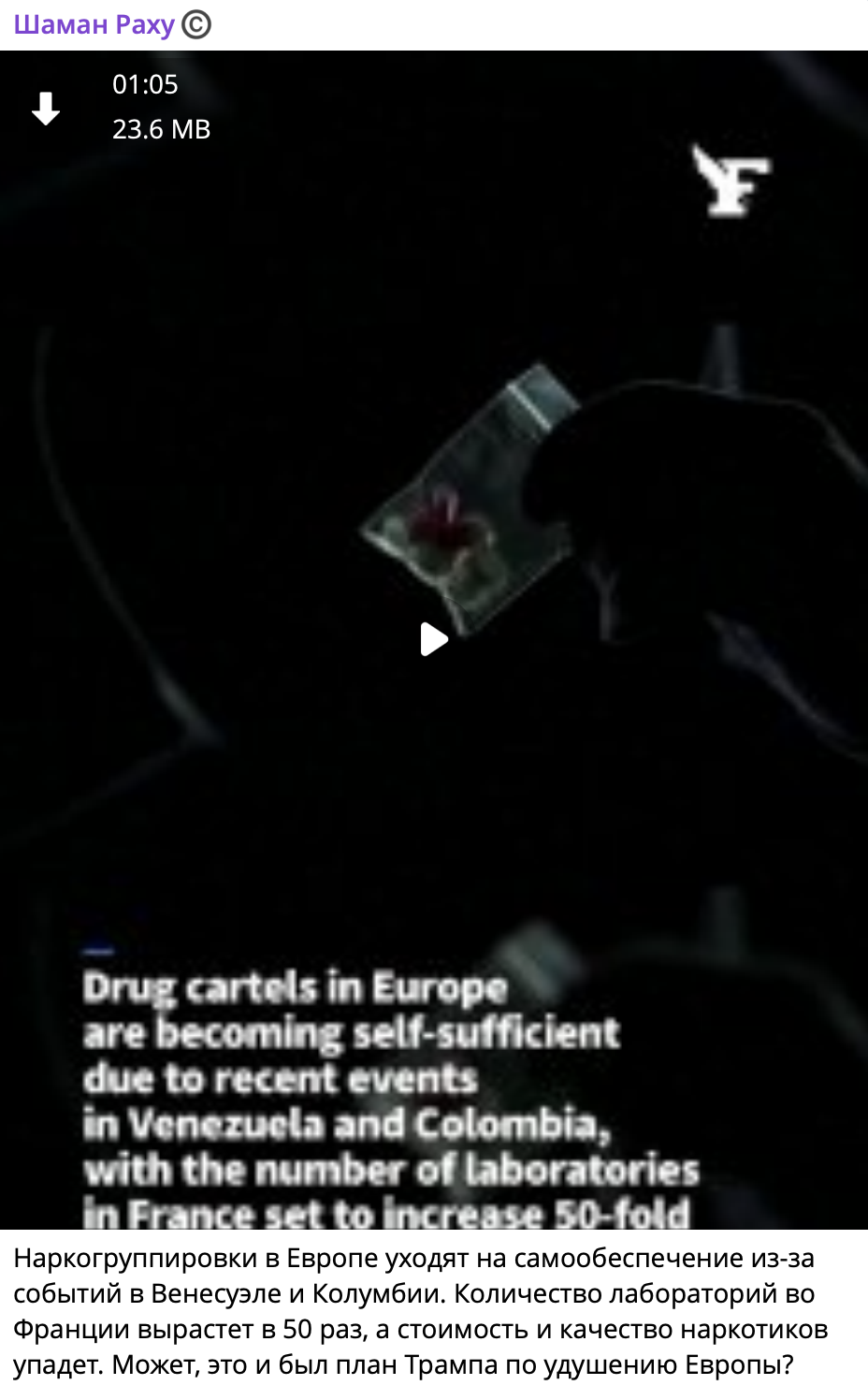 У мережі поширюють сюжет нібито видання Le Figaro. У ньому стверджують, що через події у Венесуелі та Колумбії наркокартелі в Європі стають самодостатніми. Це нібито призведе до збільшення виробництва наркотиків у Франції у 50 разів, падіння цін і браку ресурсів у поліції, а також залучить більшу кількість українців до наркотрафіку. Політолог Жерар Пруньє пов’язує це з тим, що президент Франції Еммануель Макрон більше зосереджений на підтримці України, ніж на внутрішніх проблемах країни.