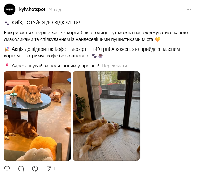 У мережі поширюють анонс відкриття кафе з собаками породи коргі в Києві. У день відкриття для відвідувачів начебто діятимуть різні акції. У дописі закликають перейти за посиланням в описі профілю, де має бути зазначена адреса кав’ярні.