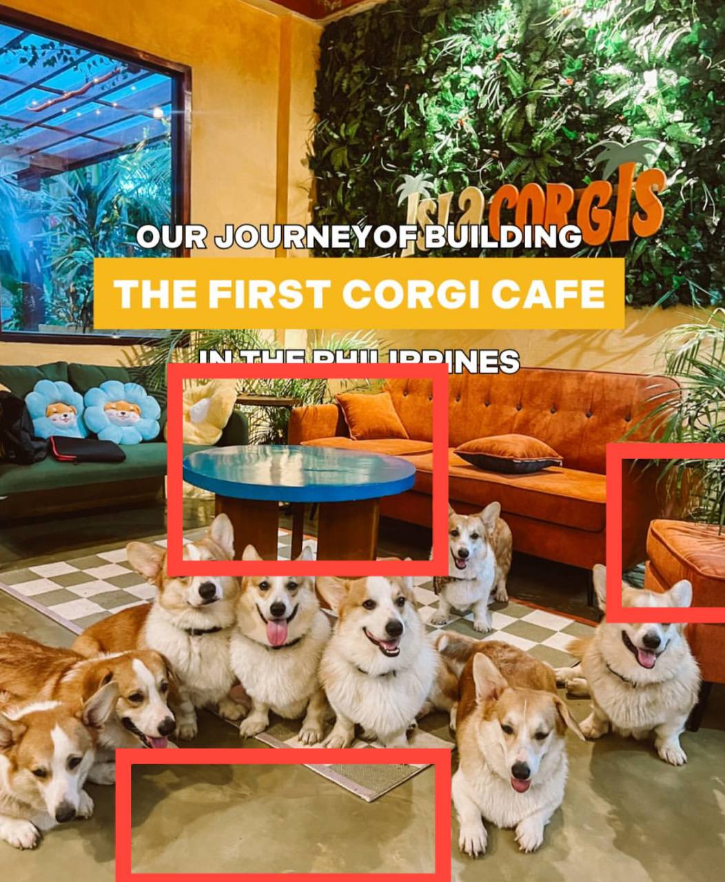 За зворотним пошуком у гуглі ми з’ясували, що фото зроблені в кафе коргі Isla Corgis на острові Сіаргао (Філіппіни). Ми знайшли кадр з іншого ракурсу, і на ньому видно ідентичні меблі — синій столик, подушки у вигляді квітки, оранжевий пуф та підлога.