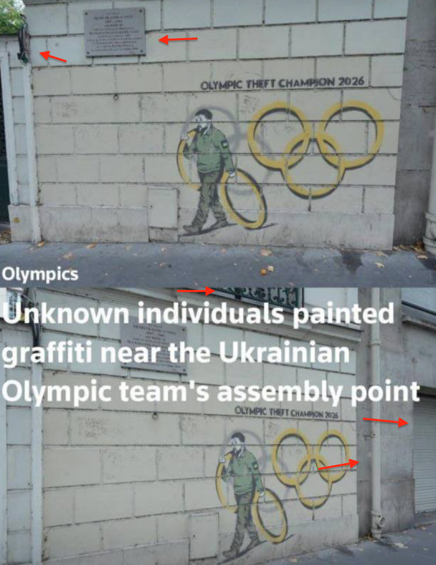 Російські телеграм-канали поширюють інформацію, нібито в Мілані, де зараз проводяться зимові Олімпійські ігри-2026, намалювали графіті з Зеленським, який краде олімпійські кільця, і написом «Олімпійський чемпіон з крадійства 2026». Видання Reuters буцімто виклало про це історію у своєму офіційному інстаграмі.