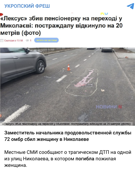 У мережі поширюють інформацію, нібито заступник начальника продовольчої служби 72-ї окремої механізованої бригади (ОМБр) збив на смерть пенсіонерку на переході у Миколаєві.