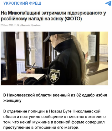 За ключовими словами ми зʼясували, що подібна новина дійсно існує. 27 січня медіа «ІншеТВ» повідомило, що на Миколаївщині затримали підозрюваного у розбійному нападі на жінку. Він намагався пограбувати потерпілу. Однак ані у статті «ІншеТВ», ані у повідомленні Головного управління Національної поліції в Миколаївській області не зазначали, що затриманий є військовим.