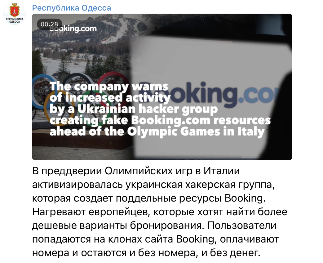 У соцмережах поширюють відео нібито сервісу онлайн-бронювання Booking.com. У ньому начебто йдеться, що напередодні Олімпійських ігор в Італії активізувалася українська хакерська група, яка створює підробні сайти Booking. Повідомляють, що користувачі переходять на клон сервісу, оплачують бронювання, але потім залишаються без грошей і житла. Італійська поліція теж буцімто випустила попередження про шахрайство.