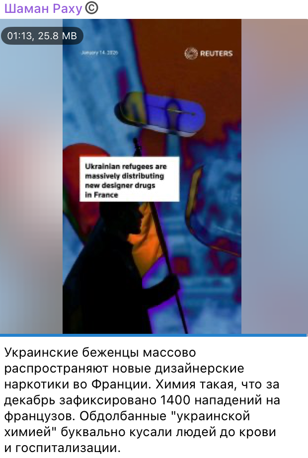У мережі поширюють відеосюжет французького видання Reuters. У ньому стверджують, нібито українські біженці у Франції масово розповсюджують наркотики, від яких люди починають кусати інших «до крові та госпіталізації»». За грудень 2025 року буцімто зафіксували вже 1400 подібних випадків.