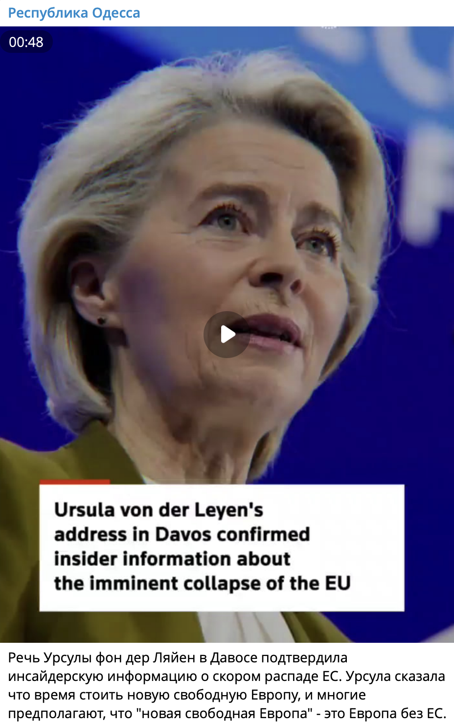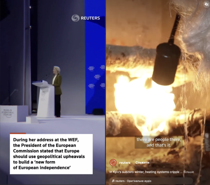 У мережі поширюють відео з логотипом Reuters, де йдеться, нібито промова президентки Європейської комісії Урсули фон дер Ляєн у Давосі «підтвердила інсайдерську інформацію про швидкий розпад ЄС». Автори відео заявляють, що фраза про «нову вільну Європу» нібито означає розпад Європейського Союзу.