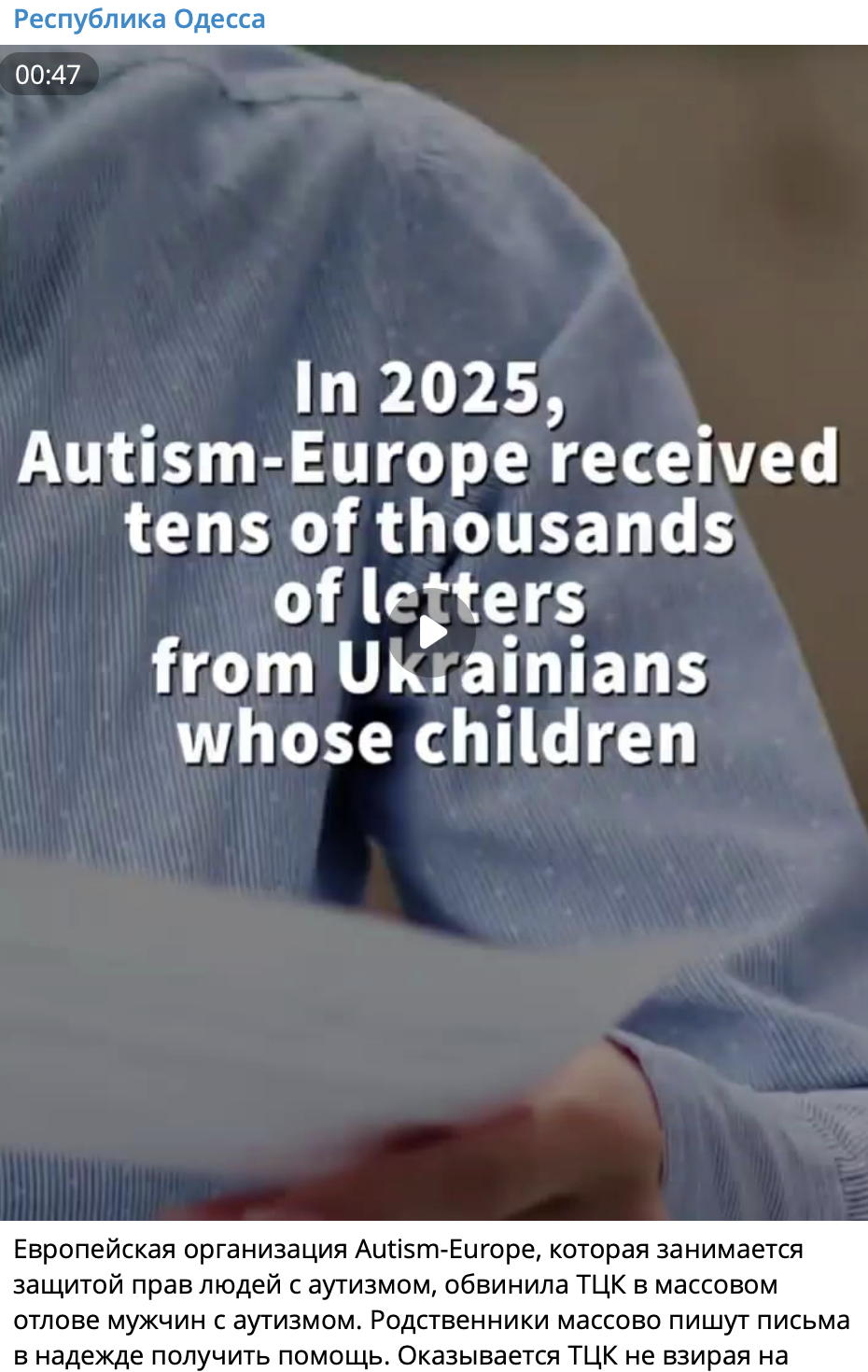 У мережі поширюють відео з логотипом міжнародної організації Autism Europe, де йдеться про те, що в Україні співробітники ТЦК та СП нібито масово мобілізують людей з аутизмом.