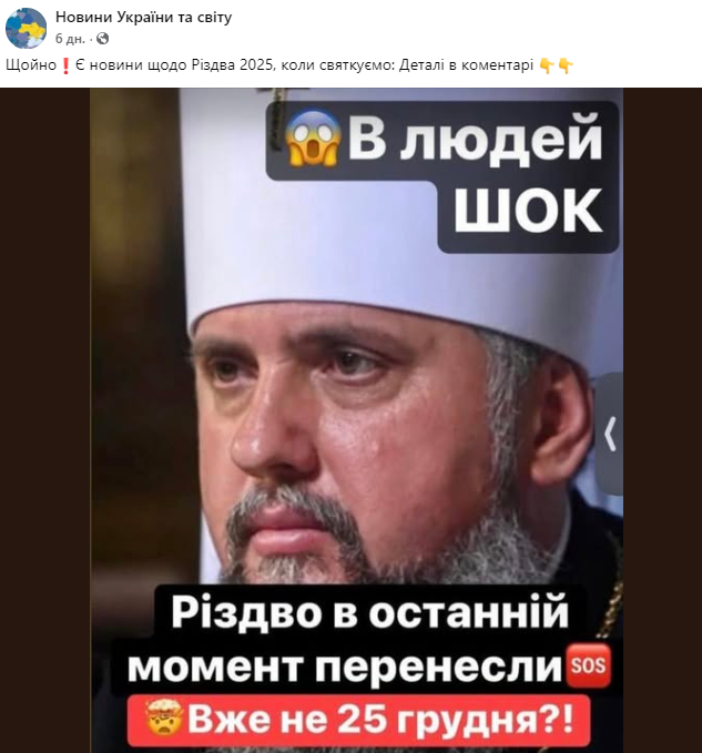 Щоб дізнатися новий день Різдва, автори допису пропонують перейти за посиланням у першому коментарі. Воно веде на статтю із заголовком: «Щойно! Є новини щодо Різдва 2025, коли святкуємо. Деталі…». Однак у ній немає жодної інформації про перенесення свята. У тексті лише розповідають, що до 2023 року Різдво в Україні відзначали 7 січня, але після переходу ПЦУ на новоюліанський календар свято перенесли на 25 грудня.