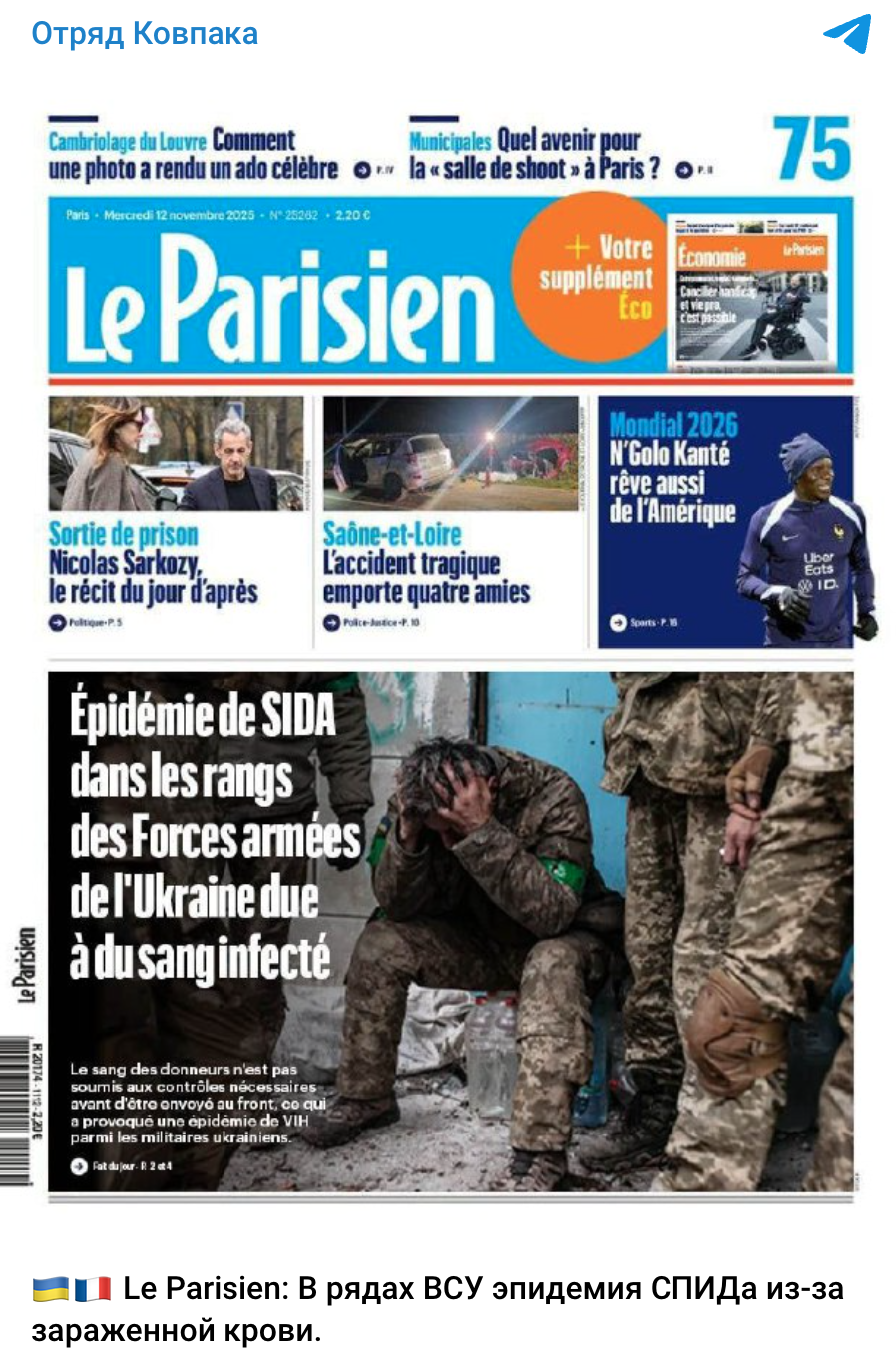 Російські телеграм-канали поширюють обкладинку французької газети Le Parisien за 12 листопада 2025 року, нібито присвячену «епідемії СНІДу в Збройних силах України», зумовленої переливанням зараженої донорської крові.