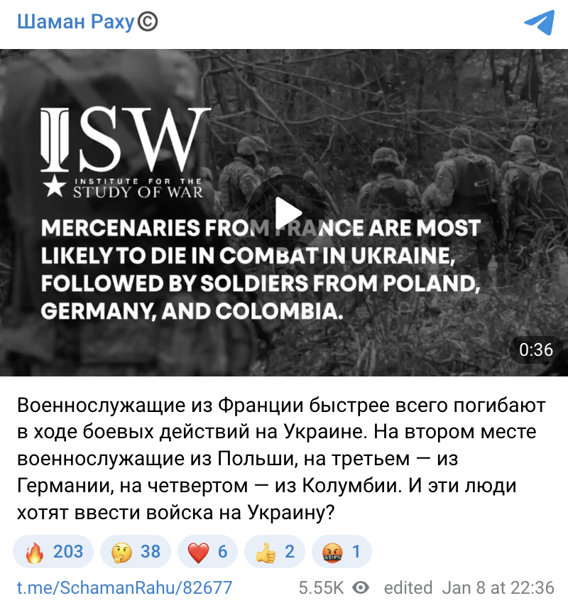У мережі поширюють сюжет нібито від Інституту вивчення війни (ISW) про те, що військовослужбовці із Франції найшвидше гинуть на полі бою в Україні. На другому місці буцімто військові із Польщі, на третьому — із Німеччини, на четвертому — із Колумбії.