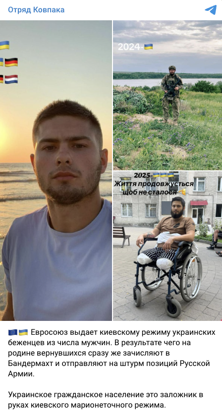 У мережі поширюють інформацію про начебто примусове повернення українських біженців з країн ЄС для служби в Силах оборони. Як підтвердження поширюють світлини чоловіка, який перебував у Європі до повномасштабного вторгнення, мобілізувався в 2024 році та втратив ноги внаслідок поранення в 2025.