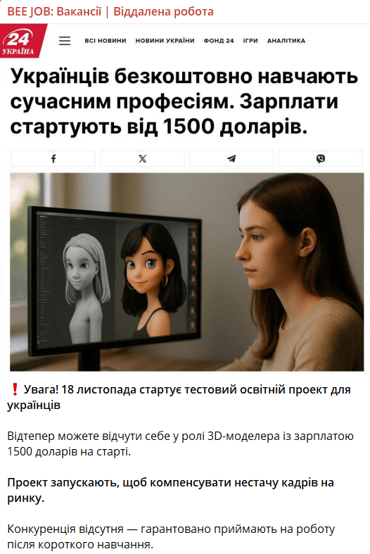 У мережі поширюють скриншот статті нібито з сайту «24 Україна» про запуск безплатного освітнього курсу з 3D-моделювання для українців.