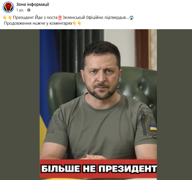 Однак це фейк. Це клікбейт, поширений для збільшення кількості підписників. Зеленський не оголошував, що йде з посади президента, а лише заявляв, що залишить пост, коли закінчиться війна.